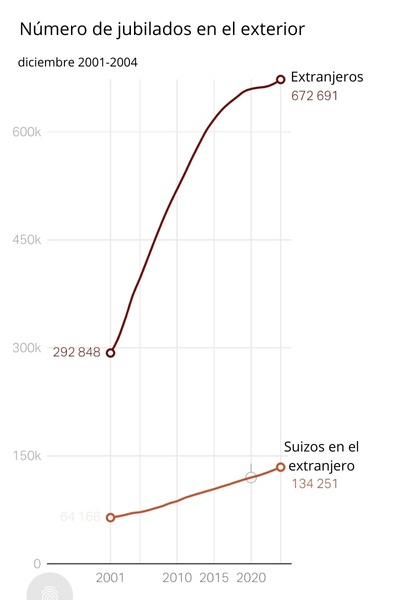Desde 2001, el número de beneficiarios ha crecido de manera constante. El aumento más notable se dio entre los ciudadanos extranjeros que reciben su pensión en su país de origen, pero también se duplicó el número de suizos emigrados con derecho a pensión: 134.000 personas en 2024.
